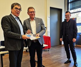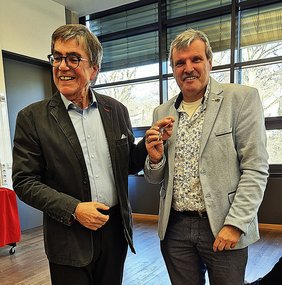 Die Neuwahlen brachten jeweils einmütige Zustimmung – bei Enthaltung der Gewählten – für die Vorschläge: Erster Vorsitzender ist Achim Frank, Zweiter Vorsitzender Alt-OB Armin Neudert, Schatzmeister Günther Treimer, Schriftführer Günter Schwendner sowie die Revisoren Franz Haselmayr und Gerhard Stitz. Soldner: „Damit sind wir unserer Tradition treu geblieben, dass das Führungsduo sich aus einem Vertreter aus Donauwörth und einem aus den acht Außenstellen zusammensetzt.“ Als sichtbares Zeichen übergab er seinem Nachfolger den Schlüssel für die Geschäftsräume im FBE/VHS-Haus im Spindeltal.